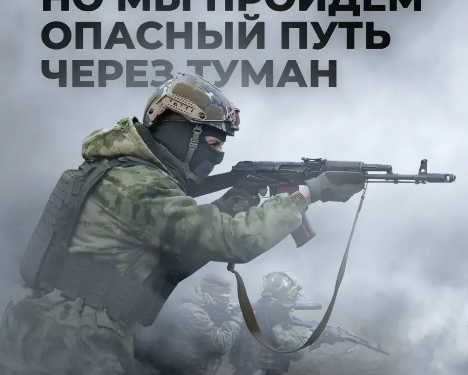 But we will walk through the dangerous path in the fog.” On the photo, a Russian soldier can be seen advancing through the fog, his silhouette barely visible against the dense, swirling mist.