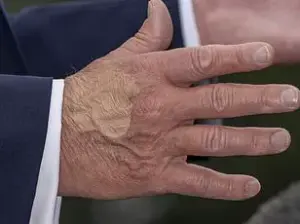 His hands, frequently photographed with visible bruising, are often concealed with makeup by White House Press Secretary Karoline Leavitt, who confirmed the discoloration is a direct result of the medication.