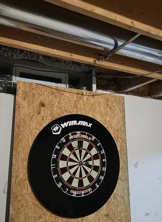 The photo, which appears to show a dartboard mounted on a piece of plywood atop a wooden table, is set against a backdrop of unfinished ceiling wood and white drywall.