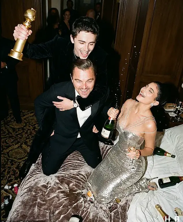 In one, he is hoisted piggyback-style by DiCaprio, clutching a Golden Globe trophy, with his beau Kylie Jenner standing nearby.