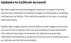 The platform’s announcement, posted to X, stated that Grok would no longer be allowed to edit images of real people in revealing clothing, such as bikinis.
