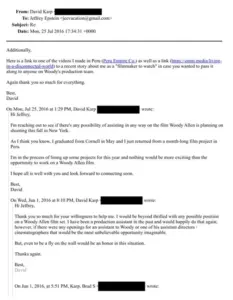 Karp’s resignation came hours after he admitted regret over asking Epstein to help his son land an unpaid job with Woody Allen. The emails show Karp pitching his 22-year-old son, David, to Allen in 2016. Epstein allegedly facilitated the introduction, calling David ‘a really good, talented kid.’ Did Karp’s actions cross ethical lines?