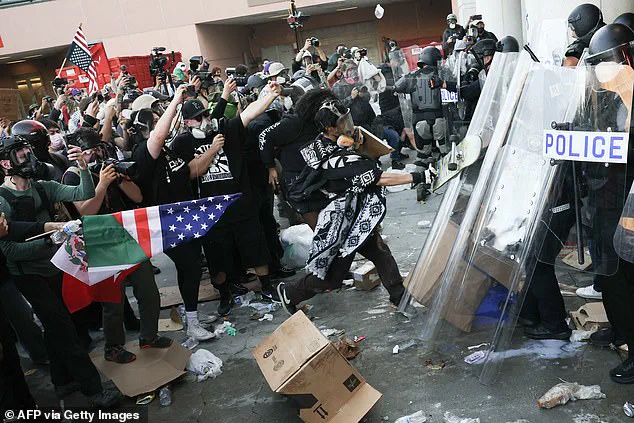 As the night continued, the LAPD arrested 'violent agitators' who were allegedly 'fighting with officers,' one of whom was accused of 'using a sling shot to shoot hard metal objects at officers who were standing on the line.' Mayor Karen Bass later confirmed that five people were arrested during the dramatic confrontation.