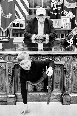But the most striking image is the one captured in May of this year: President Donald Trump, his grandson Theo Kushner peeking from the center cabinet, a modern echo of the iconic 1963 photograph of President John F.